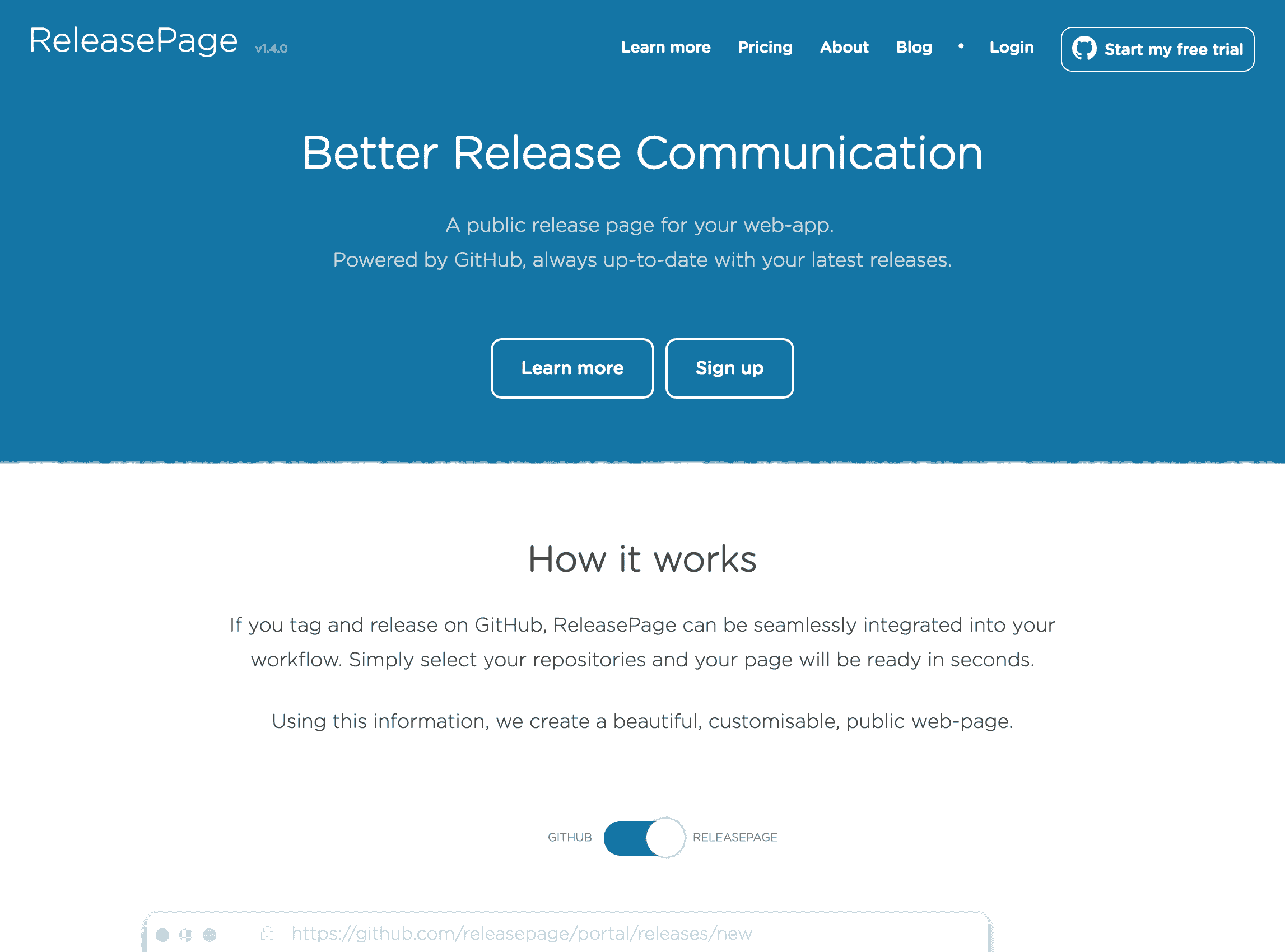 ReleasePage is one of our passion projects which provides an easier way for projects to communicate new software releases with their users. We architected, designed, and built a platform a for users to create branded, totally customised, beautiful web pages for their software release notes.